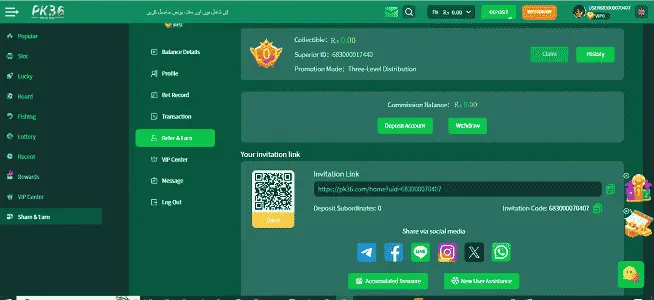 Each time someone downloads the game using your PK36 invitation code or referral link, you receive a reward of up to 500 rupees. When that person joins the game and becomes an active player, you also earn a small commission through the referral system. This process happens automatically and does not require you to play the game yourself. In this way, PK36 allows users to earn moneyfrom home simply by inviting others to join through their personal code or link.